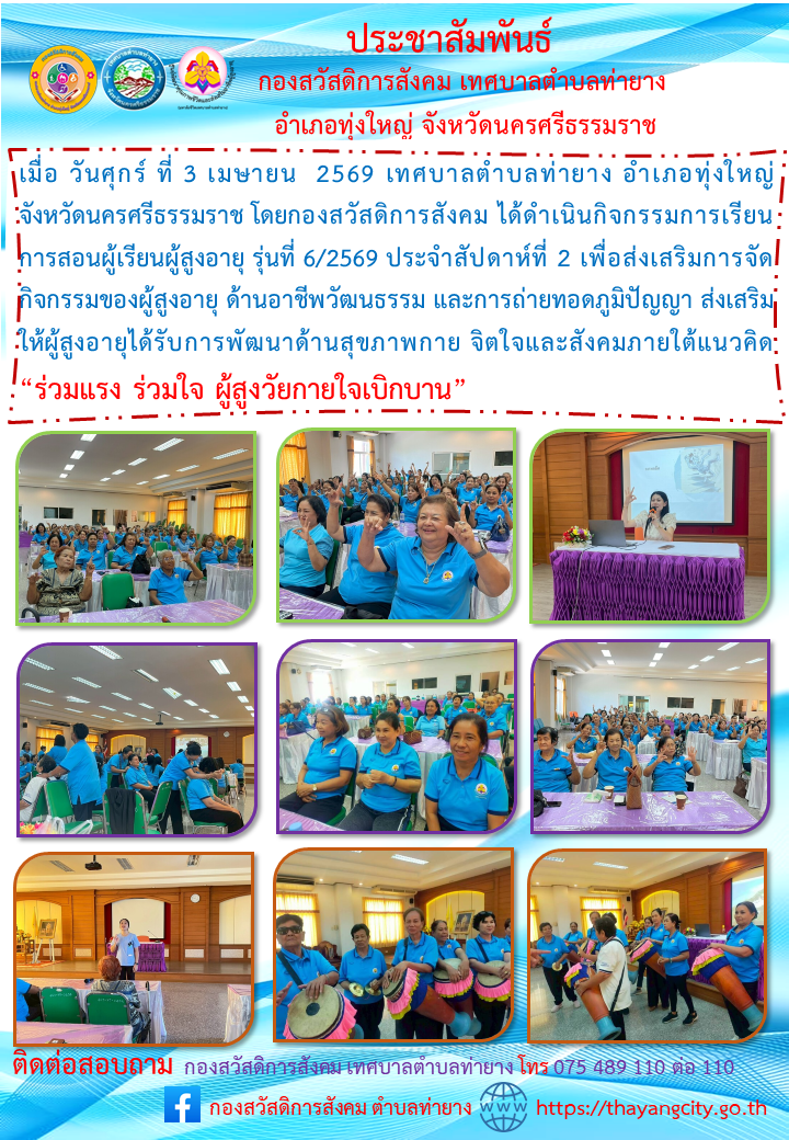 เมื่อ วันศุกร์ ที่ 3 เมษายน 2569 เทศบาลตำบลท่ายาง อำเภอทุ่งใหญ่จังหวัดนครศรีธรรมราช โดยกองสวัสดิการสังคม ได้ดำเนินกิจกรรมการเรียนการสอนผู้เรียนผู้สูงอายุ รุ่นที่ 6/2569 ประจำสัปดาห์ที่ 2 เพื่อส่งเสริมการจัดกิจกรรมของผู้สูงอายุ ด้านอาชีพวัฒนธรรม และการถ่ายทอดภูมิปัญญา ส่งเสริมให้ผู้สูงอายุได้รับการพัฒนาด้านสุขภาพกาย จิตใจและสังคมภายใต้แนวคิด “ร่วมแรง ร่วมใจ ผู้สูงวัยกายใจเบิกบาน”
