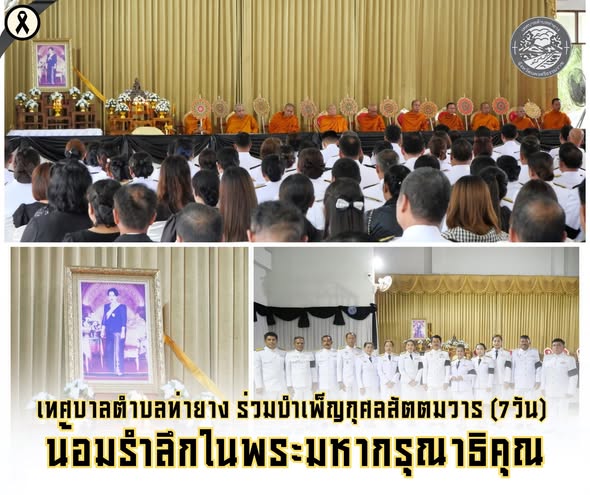 วันที่ 30 ตุลาคม 2568 เวลา 17.00 น. นายณัฐกร รักษาวงศ์ นายกเทศมนตรีตำบลท่ายาง นำคณะผู้บริหาร สมาชิกสภาเทศบาล และหัวหน้าส่วนราชการ ร่วมพิธีบำเพ็ญกุศลครบสัตตมวาร 7 วัน ถวายพระราชกุศลแด่สมเด็จพระนางเจ้าสิริกิติ์ พระบรมราชินีนาถ พระบรมราชชนนีพันปีหลวง พระผู้เสด็จสู่สวรรคาลัย ณ ศาลาประชาคมอำเภอทุ่งใหญ่ อำเภอทุ่งใหญ่ จังหวัดนครศรีธรรมราช โดยมีนายมงคล ภักดีสุวรรณ์ นายอำเภอทุ่งใหญ่ เป็นประธานในพิธี พร้อมด้วยหัวหน้าส่วนราชการ และพสกนิกรชาวอำเภอทุ่งใหญ่ เข้าร่วมพิธีโดยพร้อมเพรียงกัน |