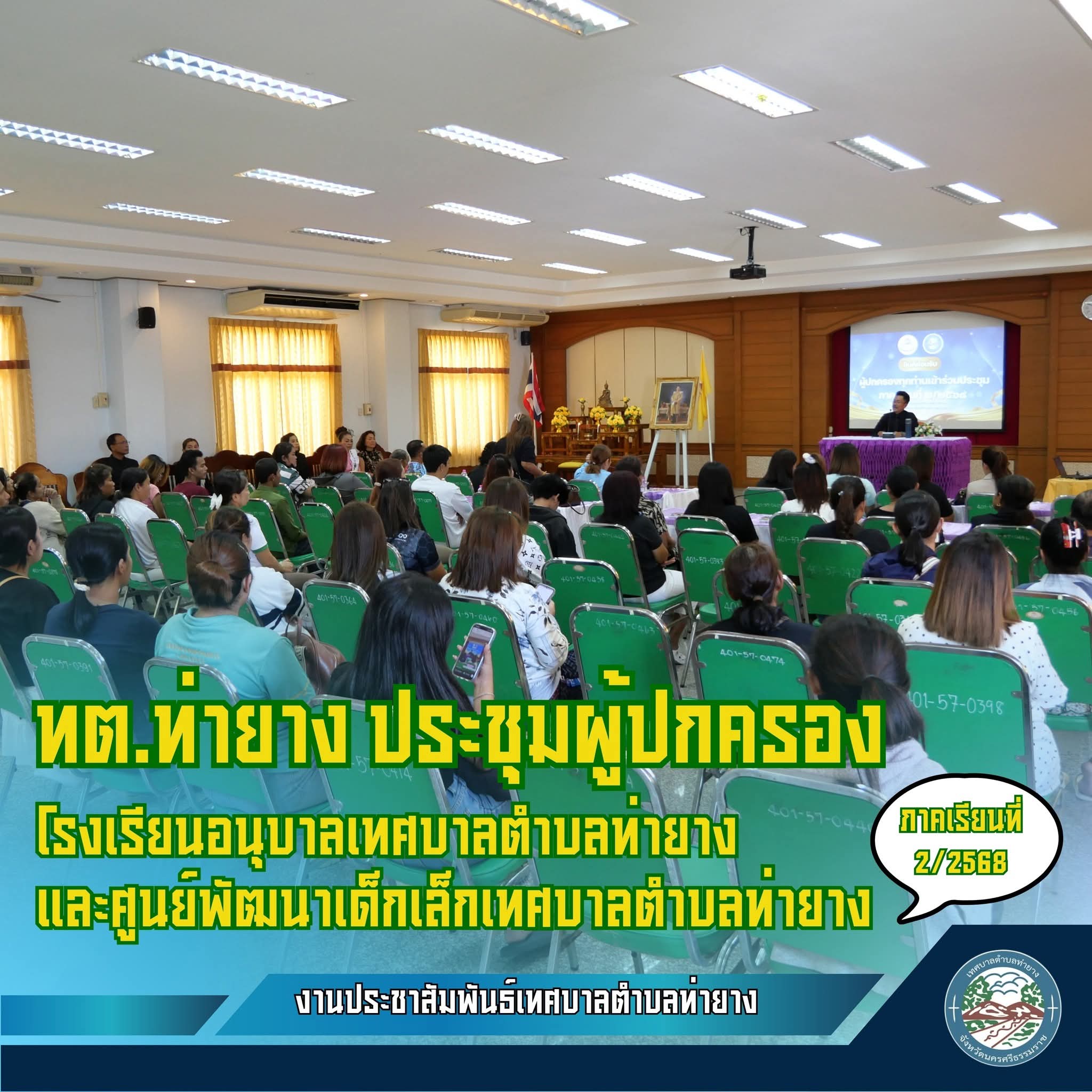 นายณัฐกร รักษาวงศ์ นายกเทศมนตรีตำบลท่ายาง เป็นประธานในการประชุมผู้ปกครองนักเรียนของโรงเรียนอนุบาลเทศบาลตำบลท่ายาง และศูนย์พัฒนาเด็กเล็กเทศบาลตำบลท่ายาง ในภาคเรียนที่ 2 ประจำปีการศึกษา 2568 โดยมีนางพวงพรรณ บุญชู รองปลัดเทศบาลตำบลท่ายาง รักษาราชการแทนปลัดเทศบาล นายประนอม รักประทุม ผู้อำนวยการโรงเรียนอนุบาลเทศบาลตำบลท่ายาง นางสาวอัจจิมา มวยดี ผู้อำนวยการกองการศึกษา คณะกรรมการสถานศึกษา บุคลากรครู เจ้าหน้าที่ที่เกี่ยวข้อง และผู้ปกครอง ร่วมประชุมในครั้งนี้ โดยมีวัตถุประสงค์เพื่อให้ผู้ปกครองได้รับทราบนโยบายของการจัดการศึกษา และแลกเปลี่ยนเรียนรู้ เชื่อมความสัมพันธ์ที่ดีระหว่างโรงเรียน ครู และผู้ปกครอง