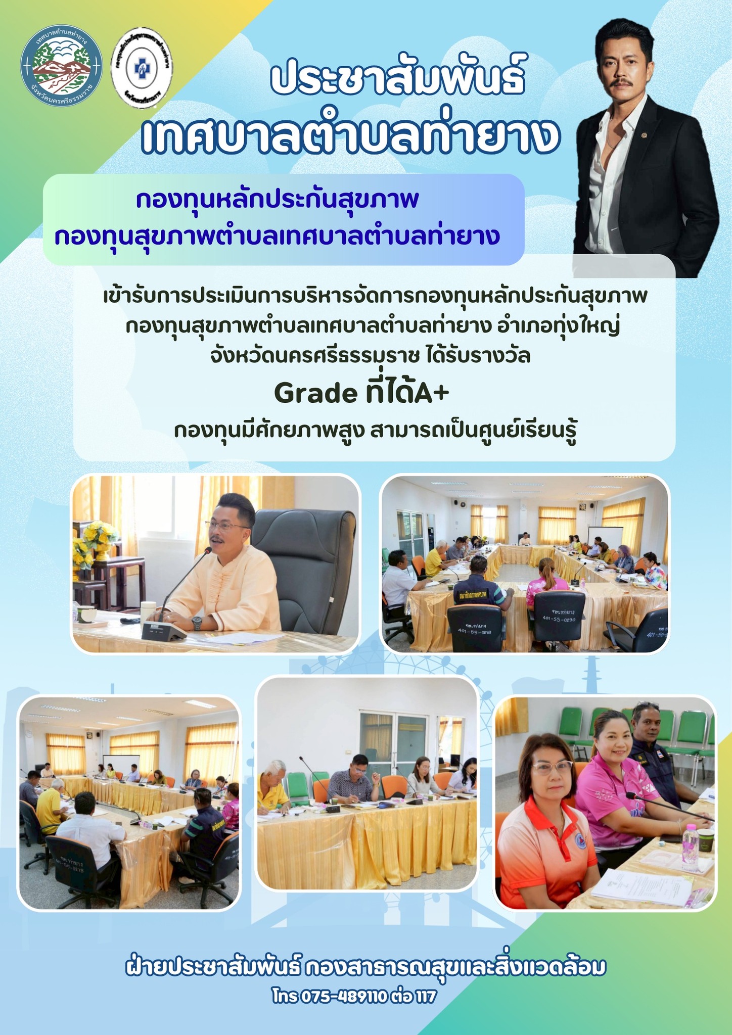 เทศบาลตำบลท่ายาง เข้าร่วมการประเมินการบริหารจัดการกองทุนหลักประกันสุขภาพ กองทุนสุขภาพตำบลเทศบาลตำบลท่ายาง อำเภอทุ่งใหญ่ จังหวัดนครศรีธรรมราช ได้ระดับ Grade A+ กองทุนมีศักยภาพสูง สามารถเป็นศูนย์เรียนรู้