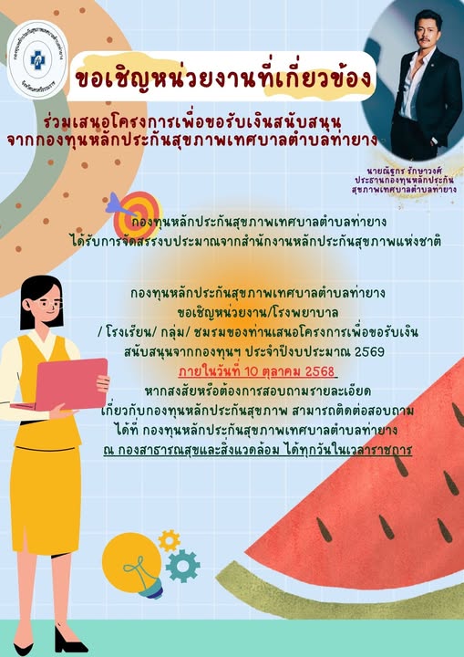 เทศบาลตำบลท่ายาง ขอเชิญหน่วยงาน/ โรงพยาบาล/ โรงเรียน/ กลุ่ม/ ชมรมของท่าน เสนอโครงการเพื่อขอรับเงินสนับสนุนจากกองทุนหลักประกันสุขภาพเทศบาลตำบลท่ายาง ประจำปีงบประมาณ 2569 ภายในวันที่ 10 ตุลาคม 2568