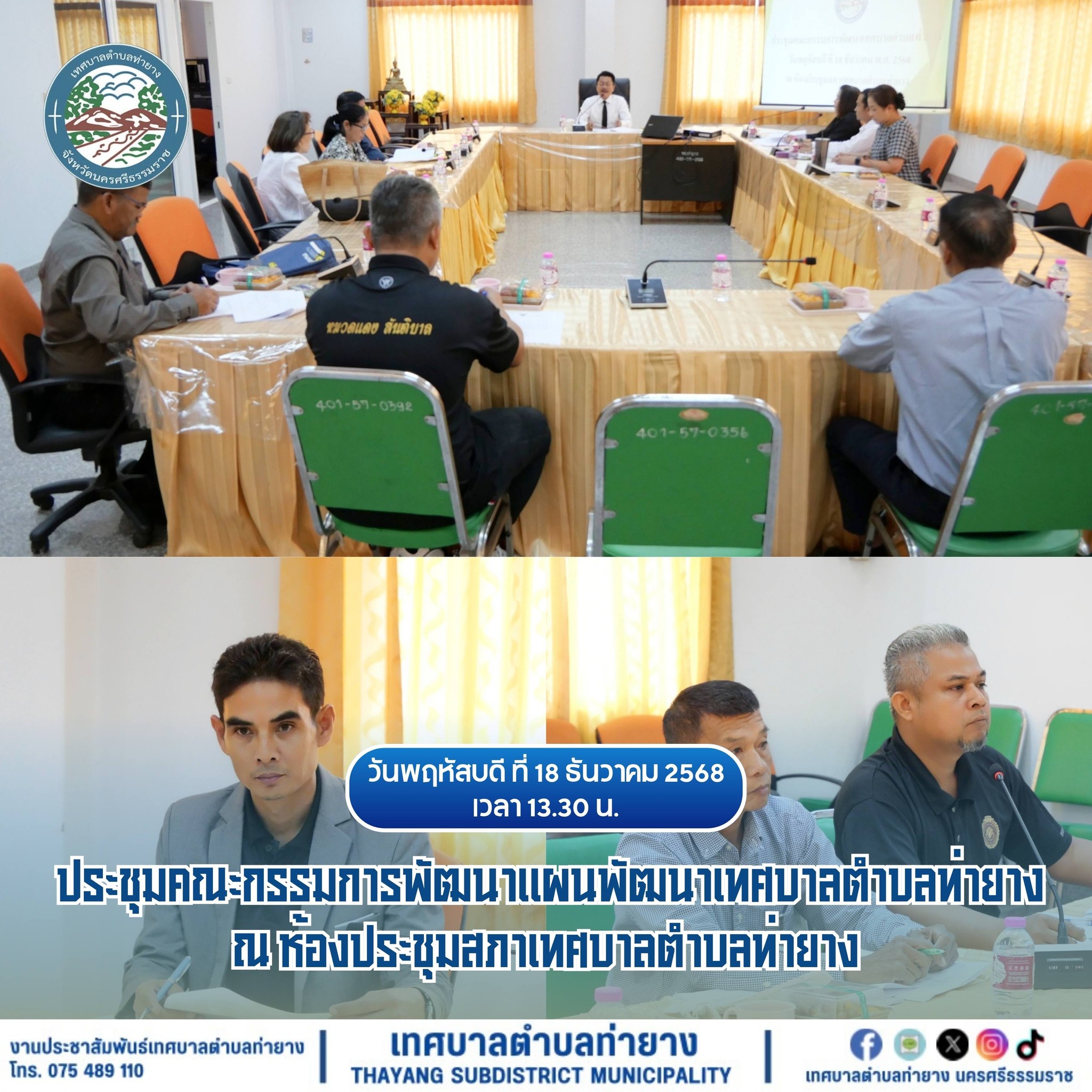 นายณัฐกร รักษาวงศ์ นายกเทศมนตรีตำบลท่ายาง เป็นประธานประชุมคณะกรรมการพัฒนาเทศบาลตำบลท่ายางเพื่อพิจารณาร่างแผนพัฒนาท้องถิ่น พ.ศ.2566 - 2570 ฉบับเปลี่ยนแปลง ครั้งที่ 2/2568 และรายงานผลการติดตามและประเมินผลแผนพัฒนาท้องถิ่นประจำปีงบประมาณพ.ศ.2568 โดยมีรองปลัดเทศบาล หัวหน้าสำนักปลัด นักวิเคราะห์นโยบายและแผน สมาชิกสภาเทศบาล ผู้ทรงคุณวุฒิ ผู้แทนภาคส่วนราชการ ผู้แทนภาคประชาคม เข้าร่วมการประชุม ณ ห้องประชุมสภาเทศบาลตำบลท่ายาง