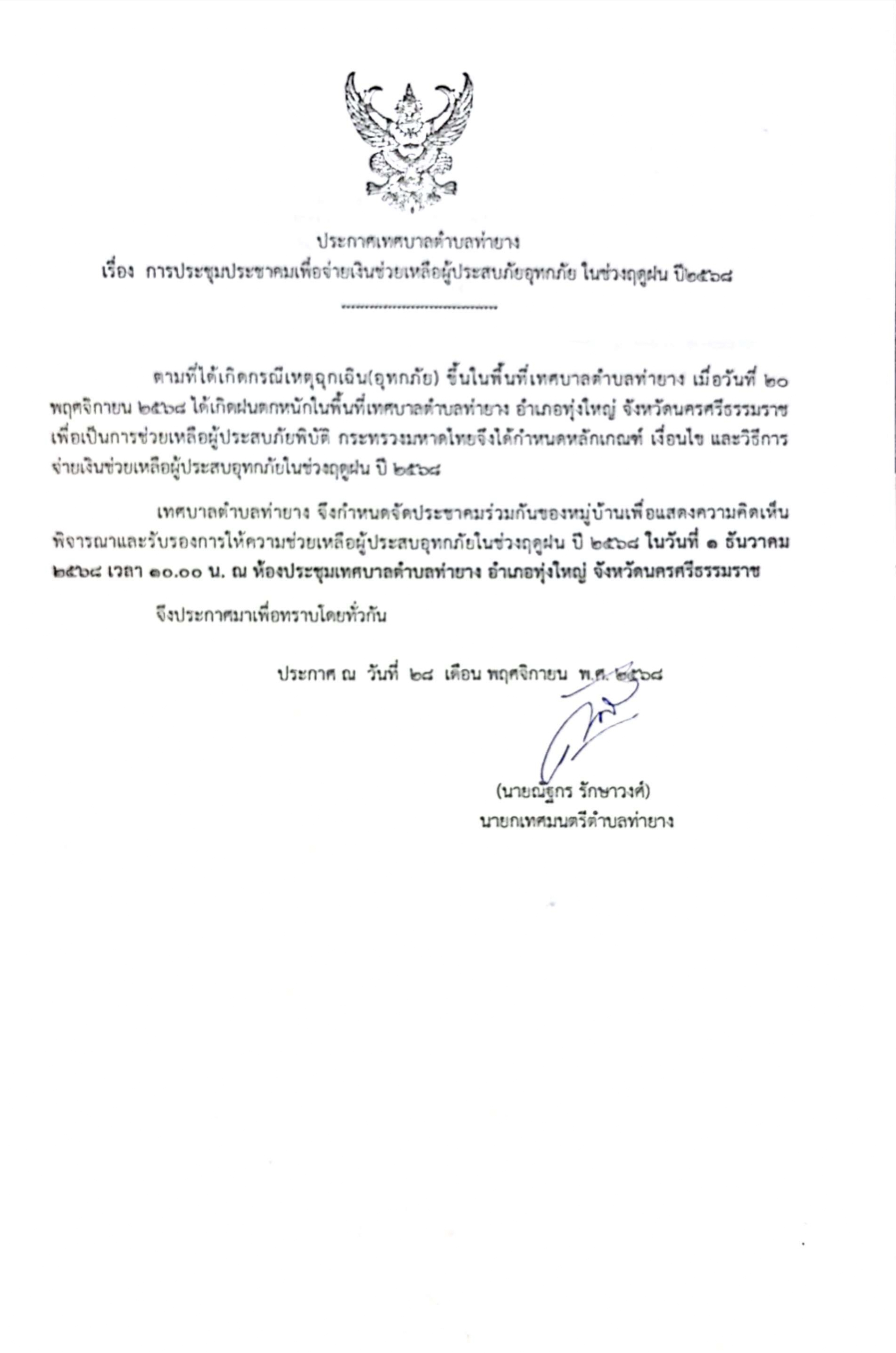 ประกาศเทศบาลตำบลท่ายาง เรื่อง การประชุมประชาคมเพื่อจ่ายช่วยเหลือผู้ประสบอุทกภัย ในช่วงฤดูฝน ปี 2568