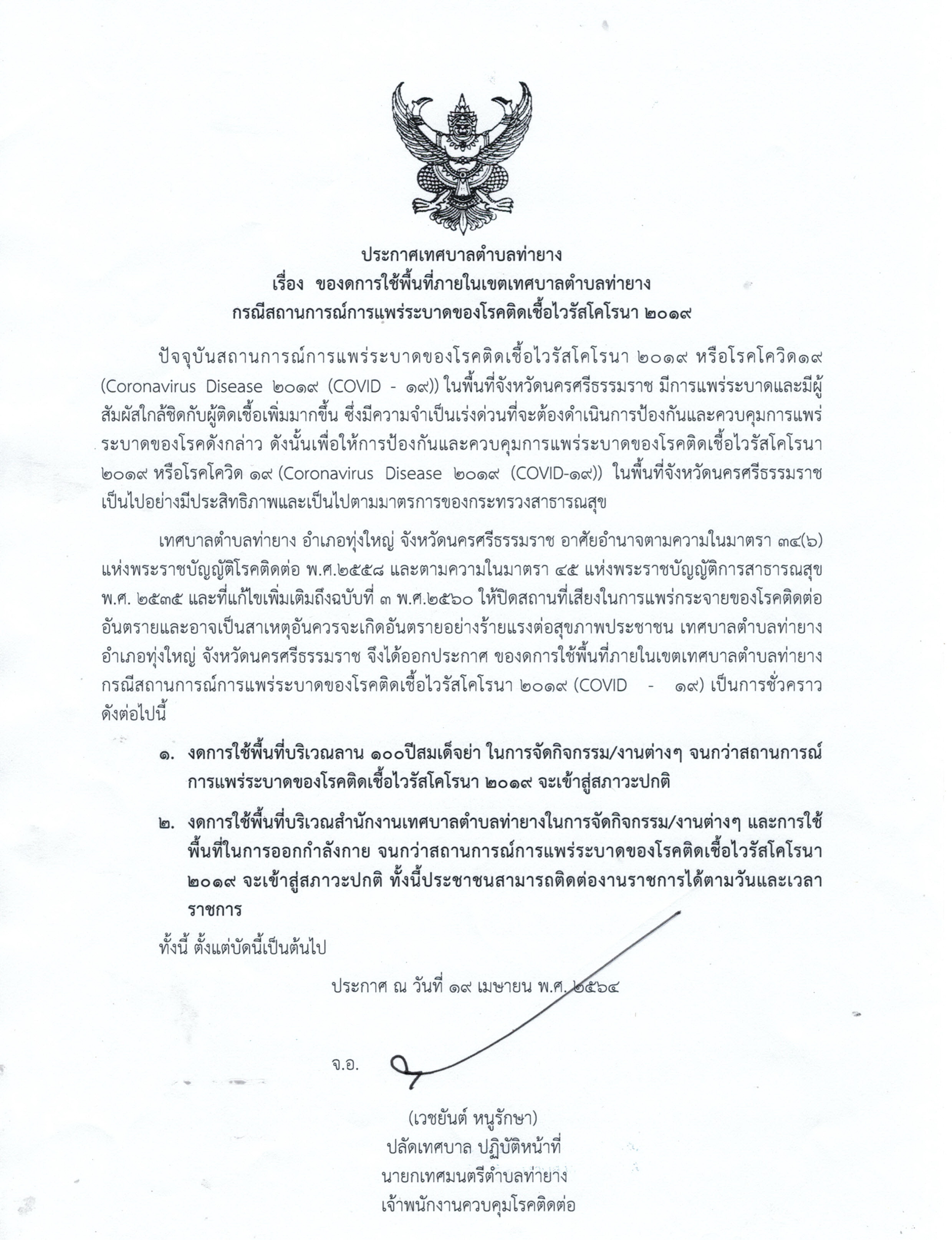 ประกาศเทศบาลตำบลท่ายาง เรื่อง ของดการใช้พื้นที่ภายในเขตเทศบาลตำบลท่ายาง กรณีสถานการณ์การแพร่ระบาดของโรคติดเชื้อไวรัสโคโรนา 2019 (COVID-19) |