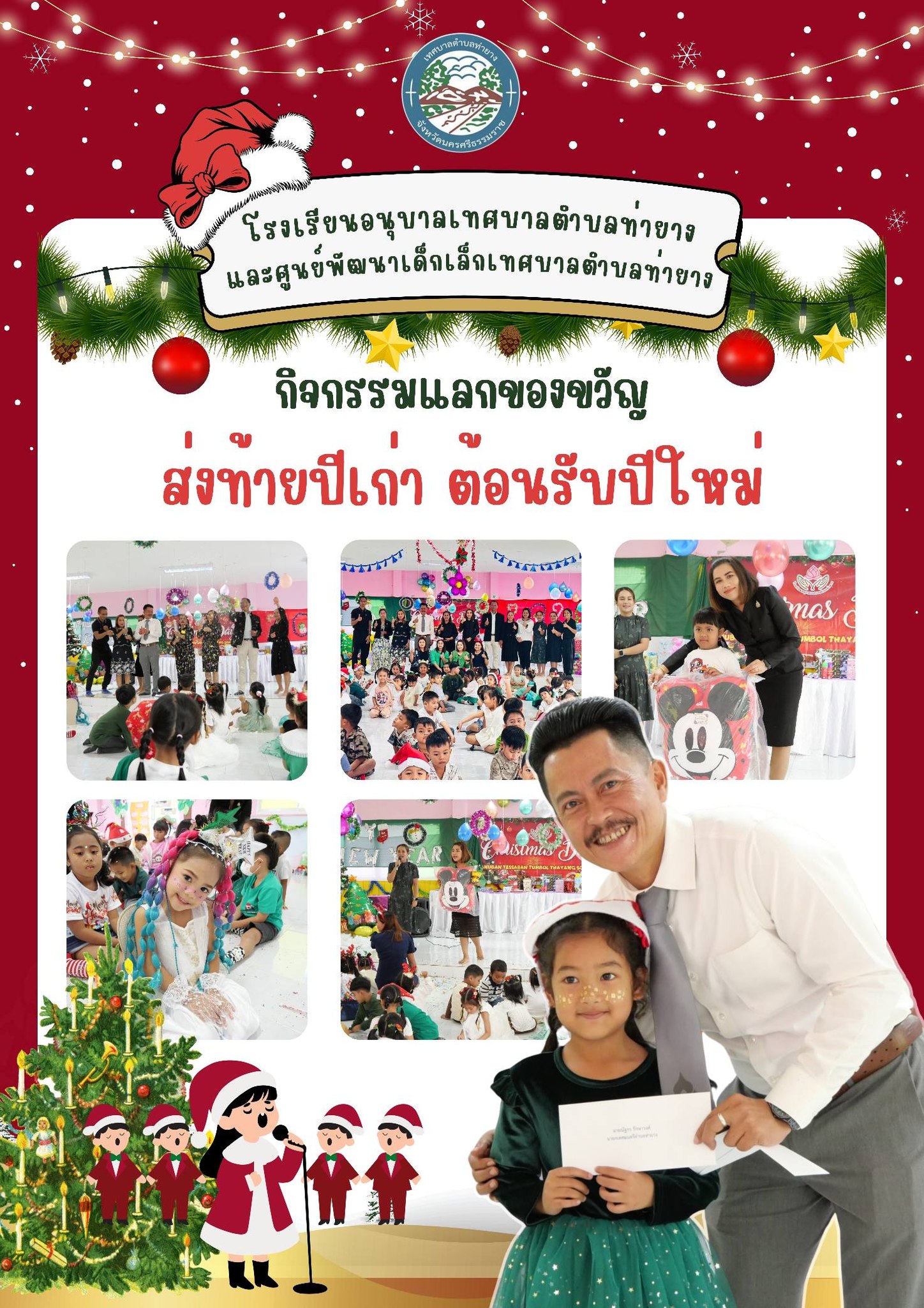 โรงเรียนอนุบาลเทศบาลตำบลท่ายาง และศูนย์พัฒนาเด็กเล็กเทศบาลตำบลท่ายาง จัดกิจกรรมแลกของขวัญต้อนรับปีใหม่ ปี 2569 เพื่อส่งมอบความสุขและรอยยิ้มให้กับนักเรียน โดยมีนายณัฐกร รักษาวงศ์ นายกเทศมนตรีตำบลท่ายาง รองนายกเทศมนตรี รองปลัดเทศบาล หัวหน้าส่วนราชการ และกองการศึกษา เทศบาลตำบลท่ายาง ร่วมมอบของขวัญและให้กำลังใจแก่นักเรียน ท่ามกลางบรรยากาศแห่งความอบอุ่น สนุกสนาน และสร้างสรรค์ ขอให้นักเรียนทุกคนมีความสุข สุขภาพแข็งแรง และเติบโตเป็นเยาวชนที่ดีของสังคมต่อไป